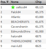 Primo in fiches è “sbatik”, che passa al Day2 con uno stack di 283.458, ben distaccato da “BarbyBallerinaa” che ne ha imbustate per oggi 250.697. Con Max Pescatori e altri membri del Team Poker Club presenti all’IPT di Saint Vincent sono stati pochi i pro a farsi vedere in questa edizione dell'”Eldorado”. Uno di lor è Dario “Trazaman” Amato, sedicesimo con 158.941 fiches. Ecco il chipcount dei primi dieci: