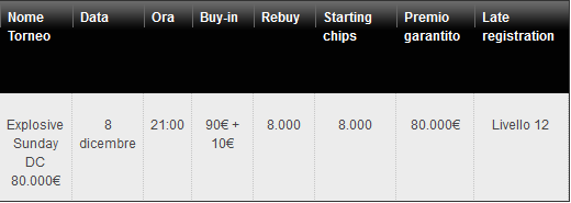 Inoltre, questo Explosive Sunday, sarà caratterizzato dalla formula re-entry: qualora una bad beat ti eliminasse prematuramente dal torneo potrai, versando altre 100€, rientrare in gioco con un nuovo stack di partenza.