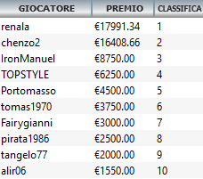 L’Eldorado finisce come molti si aspettavano, ovvero con un deal fra gli ultimi due giocatori, che hanno voluto attutire in questo modo il grosso gradino di 7.600€ previsto dal payout. Invece alla fine il vincitore, “renala” porta a casa 17.991,34€, poco più del secondo classificato, “chenzo2”, che per il suo runner-up ottiene 16.408,66€. In totale un Final Table dove c’erano più di 50.000€ in palio.
