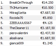 E’ rimasto fuori dai premi anche Luigi “VinciPiuTeSNAI” Curcio, in questi giorni sulla bocca di tutti dopo il bluff all’IPT su Andrea Dato, commentatissimo sulla nostra pagina Facebook. Ce l’ha fatta invece Alessio “djalexone92” Aglara, quattordicesimo per 750€, da aggiungere al suo runner-up ieri al Sunday High Stakes di Active Games.