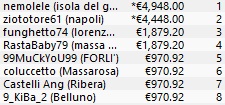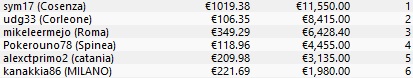 A premio giocatori di spicco come Alessandro “LuCkyTHeDoGG” Speranza (92°, 151,80€) e Antonio “mrprinco riv” Volpicelli (30°, 349,80€).