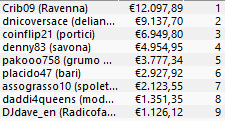 Poco meglio fa il chipleader del Day 1, ‘toferry’, che non va oltre la dodicesima posizione per 1.652,75€ totali.