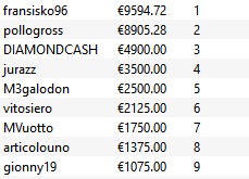 Il successo va a ‘fransisko96’, bravo a rispondere al meglio agli attacchi in heads up di ‘pollogross’: ottengono rispettivamente 9.594€ e 8.905€. Sul terzo gradino del podio finisce, invece, ‘DIAMONDCASH’, per lui 4.900€ in più nel bankroll.