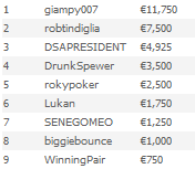 Come chiusura della Turbo Week abbiamo avuto la versione turbo dell’Explosive Sunday, che in meno di cinque ore ha concesso 50.000€ in premi a 45 dei 329 giocatori iscritti. Vince ‘al3ppp’, che porta a casa la fetta più grossa del montepremi per 9.625€, con ‘robytotti83’ che per il suo secondo posto riceve 7.250€. Questo il payout del Final Table, dove dobbiamo sottolineare il settimo posto di Davide ‘DJdaveEN’ Nutarelli (1.700€):