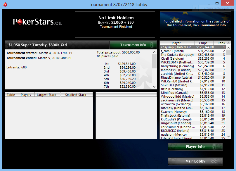 Dopo lo straordinario secondo posto ottenuto la scorso 26 febbraio da Giuliano Bendinelli al Super Tuesday da 1,050$ su Pokerstars.com, stanotte c’è qualcuno che ha battuto il suo ‘record’: Stefano ‘easylimp’ Terziani, toscano emigrato a Londra da novembre, è riuscito infatti nell’impresa di vincere lo stesso torneo, strapazzando 687 avversari per portare a casa i 129,344$ del primo premio.