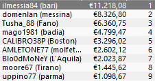 Tavolo finale per Alessandro ‘Blo0dMoNeY’ Speranza, settimo per 2.023,87€, mentre si arresta all’11° posto la corsa di Lorenzo ‘bovediroma’ Sabato: vanno a lui 925,20€.