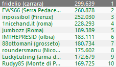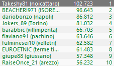 Buona la prestazione del regular pugliese ‘Rikk4rdo’, 39° con 90.553, poche posizioni davanti rispetto al siciliano Vito ‘Dettoinverno’ Planeta, 47° con 82.423, il quale, a sua volta, è ‘tallonato’ da Lorenzo ‘bovediroma’ Sabato, 48° con 81.689.