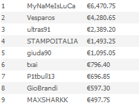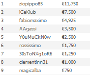 Fra gli altri giocatori a premio troviamo altri reg come Andrea ‘andreapuppa’ Sorrentino (21°) o il pro GDpoker Eros ‘Celtico84’ Mossali (41°), che dopo il suo brillante WPT di Venezia è tornato subito in modalità online.