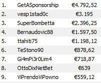 Dopo 5 ore e 33 minuti il vincitore di questo torneo è ‘GetASponsorship’, che incassa 4.792,52€. Da sottolineare il quarto posto di Antonio ‘Bernaudovic88’ Bernaudo, anche lui come Eros Mossali rientrato alla grande dopo la sua prestazione in laguna. Sbolla i premi e i Final Table Alessio ‘djalexone92’ Agarla, mentre rimangono anche vicini Ferdinando ‘ImGodPlsMuck’ Lo Cascio di Titanbet (14°) e Davide ‘DJdaveEN’ Nutarelli (17°).