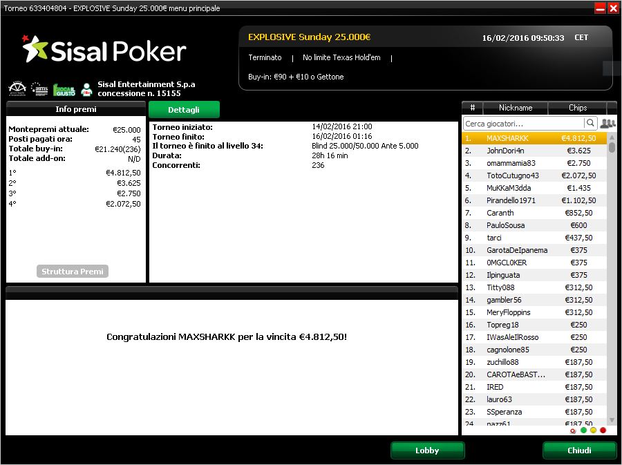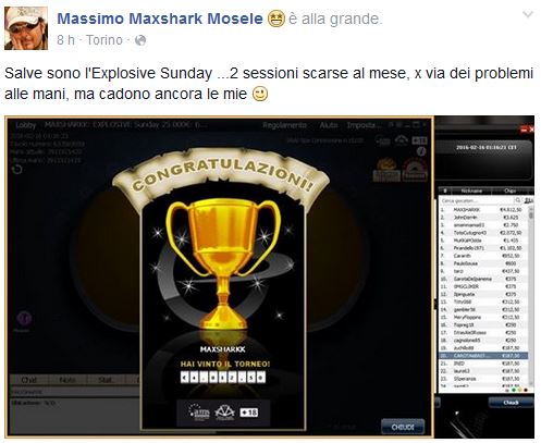 L’Explosive Sunday di Paddy Power, infatti, lo ha conquistato alle ore 01.16 di oggi il torinese Massimo ‘MAXSHARKK’ Mosele, che ha così incassato una prima moneta di 4.812 euro.