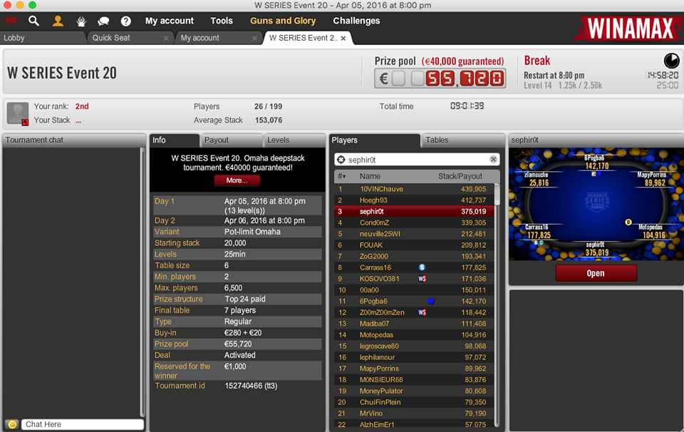 Sulla scia dell’entusiasmo, infatti, Palumbo ha deeprunnato nell’evento delle Winamax Series di PLO da 300€ di buy-in, dove sono ancora in gioco in 26 (sono partiti in 199) e ‘sephir0t’ è attualmente terzo con 375.019 chips.