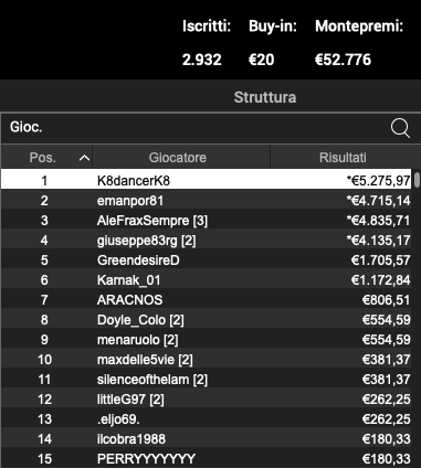 La parte più alta del montepremi da €55.710, superiori al Garantito da €50.000, è andata al vincitore in misura di €9.187,49, conquistati dopo il testa a testa conclusivo condotto in porto contro “vilma72“, secondo per €6.631.