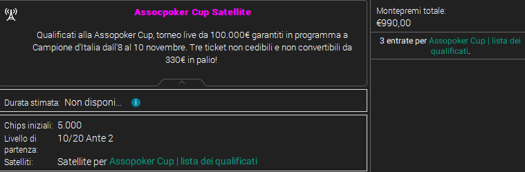 Domenica alle ore 21:30 su PS.it si gioca un altro Satellite per la Assopoker Cup di Campione con ben 990 euro regalati. Per tutti 5mila chips di partenza e bui iniziali 10/20.