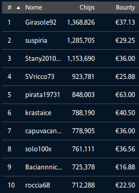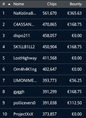 Comanda nettamente nel count provvisorio ‘NaKolinaBlyadi’ con 561.670 di stack. Considerate che per tutti sono 100.000 le chips iniziali. Il bounty più ricco è arrivato a 365 euro: è proprio quello del nick in testa. A voi la top dieci dettagliata…