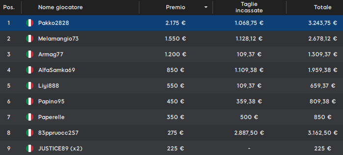 Il primo classificato ‘Pakko2828’ prende 3.243 euro totali superando ‘Melamangio73’. Ma dobbiamo citare anche la taglia da 2.887 euro dell’ottavo classificato Giuseppe ‘83ppruocc2S7‘ Ruocco; per lui 3.162 euro totali.