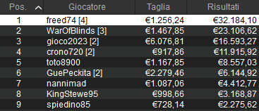 Al tavolo finale spicca quella da 6.076 euro del terzo ‘gioco2023’: lui in tutto prende 22.670 euro. Seconda piazza e 24.574 euro complessivi per ‘WarOfBlinds’. Il vincitore ‘freed74‘ incassa invece 33.440 euro totali!