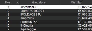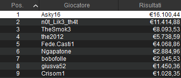 Alle ore 23:24 per la precisione è arrivata la vittoria di Patrick ‘instantcal89’ Sanfilippo: a lui 9.022 euro. Secondo posto e 6.693 euro per ‘giammyago3001’. Terzo Federico ‘IFOLDACES4U’ Piroddi.