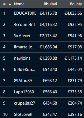 Alle ore 4:22 tutto è finito con la grande vittoria di ‘EDUCATORE‘. Per lui ben 4.033 euro di taglia e in totale 8.150 euro. Il secondo ‘4ccount4nt’ si becca 5.042 euro complessivi. Terza piazza per ‘SirAlexei’.