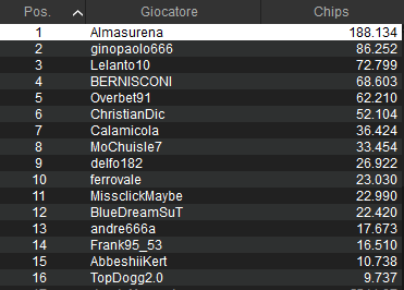 L’altro domenicale in sospeso su PokerStars e Sisal è questo High Roller solito che garantiva 30mila euro dalle 22:00. Qui erano 20 i posti ITM (da almeno 541 euro) e ora restano 16 stack in gioco. Comanda nettamente ‘Almasurena‘ che spera di mettere le mani su 6.995 euro di prima moneta.
