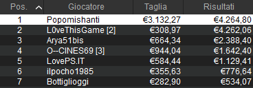 E finiamo con questo bel 7-Max Progressive KO da 50mila euro garantiti che ha contato 1.219 rientri e 657 posti pagati. Il trionfatore ‘Popomishanti‘ alle 4:03 ha preso 7.397 euro totali. Secondo posto per ‘L0veThisGame’, terzo per ‘Arya51bis’.