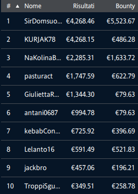 Alle ore 3:34 il sipario è calato definitivamente con la grande vittoria di ‘SirDomsuolll‘. A lui vanno ben 5.523 euro di bounty per un totale di 9.792 euro. Il secondo ‘KURJAK78′ si becca 4.754 euro. Terza piazza e bella taglia da 1.633 euro per NaKolinaBlyadi’ che stava in testa al Day 1.