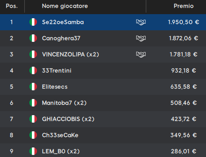 Per una volta finiamo con il miglior torneo serale della room 888. Sono stati qui 25 i rientri e 17 i premiati in 5 ore e 53 minuti di gioco. Un deal a tre ha messo fine al final table con premi spalmati per bene. Il vincitore ‘Se22oeSamba‘ prende 1.950 euro. Completano il podio ‘Canoghera37’ e ‘VINCENZOLIPA’.