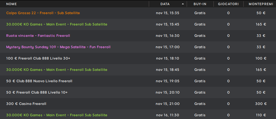 Le poker room italiane continuano a proporci ogni giorno tornei gratuiti con bei premi in palio. Andiamo allora a farci un giro nelle varie lobby del ‘punto it’ per capire quali sono i migliori freeroll in palinsesto in questo weekend di metà novembre.