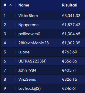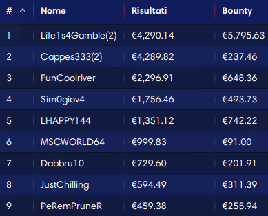 Alle ore 3:22 il sipario è calato con la trionfale affermazione di ‘Life1s4Gamble‘; a lui vanno ben 5.795 euro di bounty e un gran totale di 10.085 euro. Il runner-up ‘Cappes333’ si accontenta di 4.527 euro complessivi. Terzo posto per ‘FunCoolriver’.