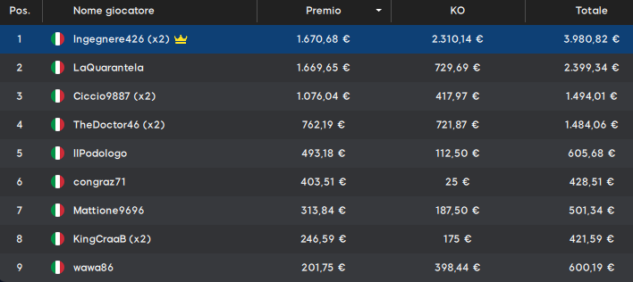 Finiamo con questo interessante torneo serale della room 888. Ci sono stati 60 rientri e dopo oltre 5 ore di gioco è stato ‘Ingegnere426’ a spuntarla su ‘LaQuarantela’. Al primo vanno 3.980 euro totali, al secondo 2.399 euro. Buone cifre anche per ‘Ciccio9887’ e ‘TheDoctor46’.