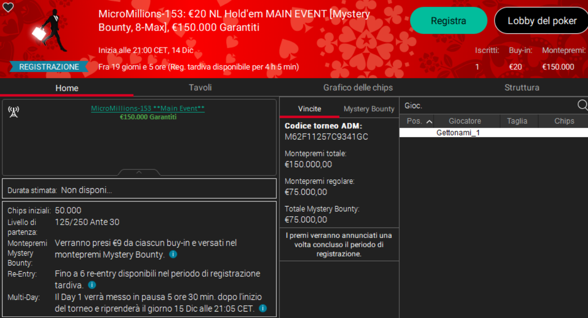 Dec 14 – 21:00 € 20,00 MicroMillions-153 | MAIN EVENT | MYSTERY BOUNTY | €150,000 Guaranteed