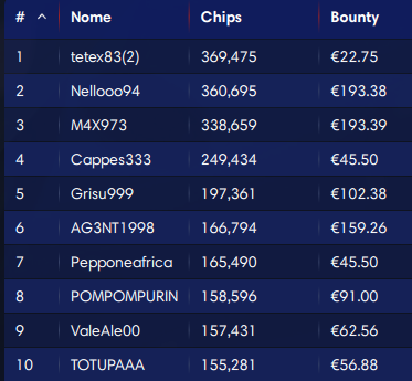 25.000 € Mystery Bounty Sunday 109 (buy-in 109, montepremi 27.522, iscritti 278)