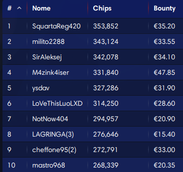 Nell’attesa comanda nel count ‘SquartaReg420‘ con 353.852 di stack. La migliore taglia vale 47 euro: è quella del quarto ‘M4zink4iser’. Ecco la top ten attuale pure qua: