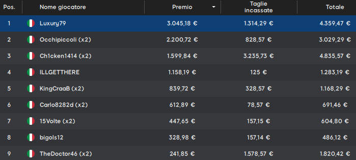 Il primo classificato ‘Luxury79’ prende 4.359 euro totali. Ma possiamo dire che il vero vincitore è il terzo classificato ‘Ch1cken1414‘; questo perché la sua taglia da 3.235 euro gli ha permesso di aggiudicarsi 4.835 euro totali. Bella anche la taglia da 1.578 euro del nono ‘TheDoctor46’.