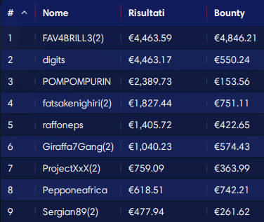 Il trionfatore ‘FAV4BRILL3‘ si becca 4.846 euro di bounty e 9.309 euro totali. Al runner-up ‘digits’ vanno 5.013 euro. Completa il podio ‘POMPOMPURIN’. Eccovi il payout dettagliato dei finalisti, ai quali facciamo ovviamente i complimenti!