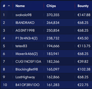 Comanda nettamente nel count provvisorio ‘svalvolo98’ con 370.355 di stack. Considerate che per tutti sono 30.000 le chips iniziali. Il miglior bounty è però quello da 153 euro del 15° in classifica ‘amby07‘. A voi la top dieci dettagliata…