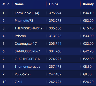 Nell’attesa comanda nel count ‘EddyGerval11‘ con poche chips in più rispetto a ‘Pitamatto78‘. La migliore taglia è quella del secondo: 53 euro. Ecco la top ten attuale pure qua: