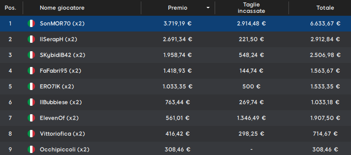 Il primo classificato ‘SonMOR70’ prende 6.633 euro totali, contando anche una super taglia da 2.914 euro. Spiccano poi le taglie a quattro cifre del settimo classificato ‘ElevenOf’ e del 14esimo ‘Alexei7323’.