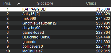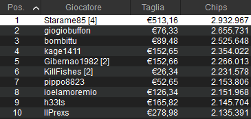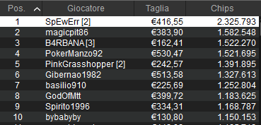 Lo scalino attuale dei premi vale 28 euro e si punta una prima moneta da 9.275 euro. In cima al count c’è ‘Starame85‘ con ottimo stack. Considerate che l’avg è di 625.655 per la precisione.