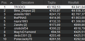 Finiamo con il Colossal Stack 7-Max Progressive KO domenicale, così almeno possiamo darvi dei risultati definitivi. Qui tra 1.140 rientri e 629 ITM ha trionfato ‘TR3DICI‘: per lui ben 3.162 euro di taglia e 8.104 euro totali. Secondo posto per ‘Bine_Dispus’, terzo per ‘violento1981’.