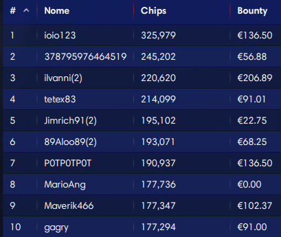 Comanda nettamente nel count provvisorio ‘ioio123’ con 325.979 di stack. Considerate che per tutti sono 30.000 le chips iniziali. Il miglior bounty è però quello da 206 euro del terzo in classifica ‘ilvanni‘. A voi la top dieci dettagliata…