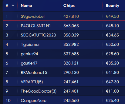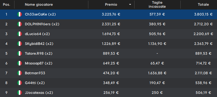 Ma bisogna scendere fino alla posizione 18 per trovare di fatto il vero vincitore del torneo in termini monetari: Domenico ‘BlackDomo97’ Di Vito ha incassato ben 3.755 euro di taglia e 3.881 euro totali. Al tavolo finale ottime anche le taglie di ‘SKybidiB42 (4°) e ‘Batman933 (7°).