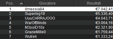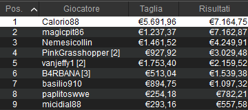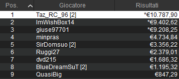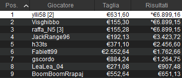 Così il vincitore ‘ylli58‘ prende in tutto 7.530 euro alle 4:17. Completano il podio ‘Visghibbo’ e Raffaele ‘raffa_N5’ Francese. Al tredicesimo posto chiude ‘IndianoRosso‘ con la miglior taglia da 5.546 euro. Bravi tutti i citati e non solo!