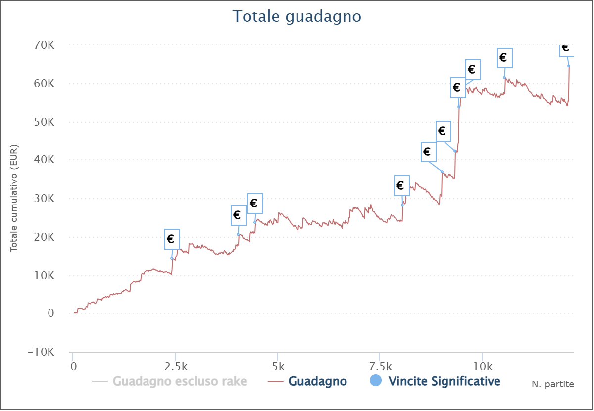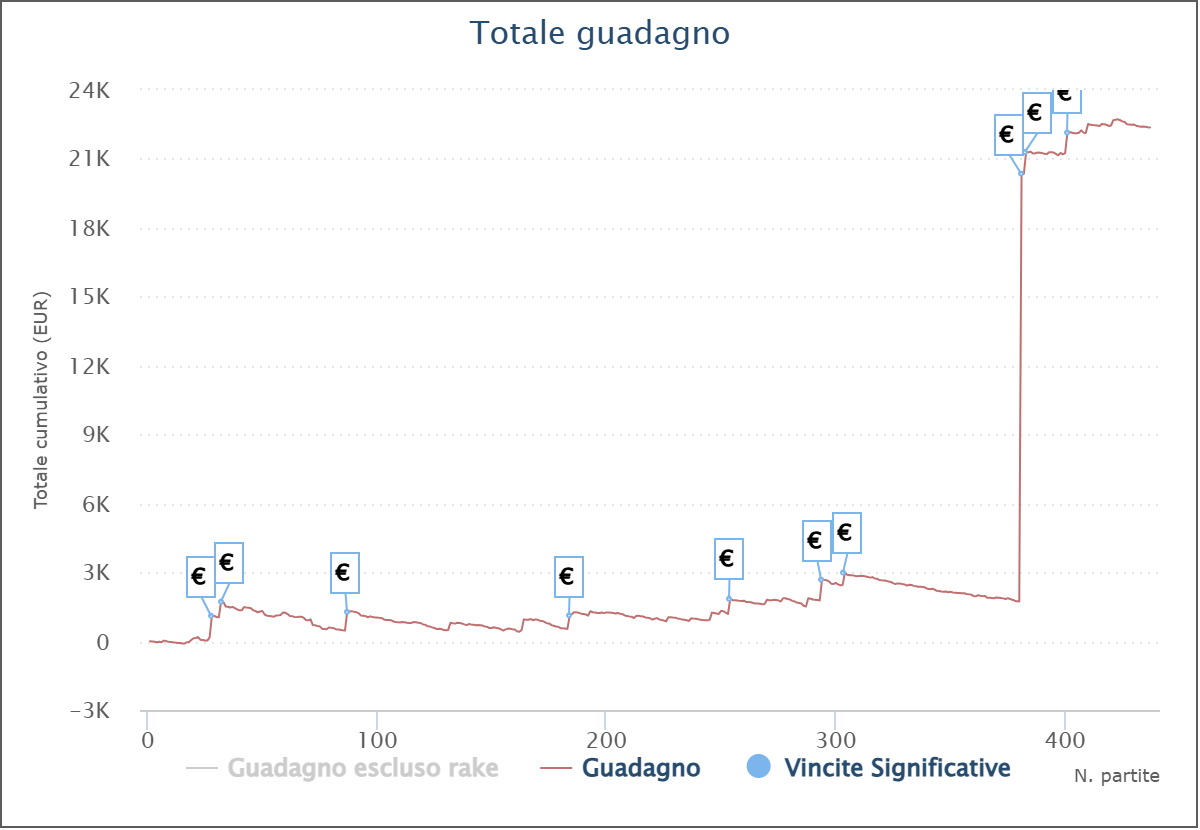 Vediamo subito i grafici e le statistiche di gioco dei player che vedrete all’opera. Il vincitore ‘0Walter_White0’ ha giocato il primo torneo sul PokerStars Network a novembre di quest’anno. Oggi ha accumulato ben 437 tornei a buy-in medio per 22.366€ di profit, in larga parte ovviamente determinati da questo successo.