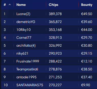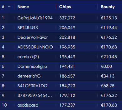 Comanda nettamente nel count provvisorio ‘CeRqUaNuTs1994’ con 337.072 di stack. Considerate che per tutti sono 30.000 le chips iniziali. Il miglior bounty è però quello da 210 euro del quinto in classifica ‘camixxx‘. A voi la top dieci dettagliata…