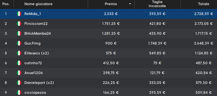 Ma bisogna scendere fino alla posizione 19 per trovare di fatto il vincitore del torneo in termini monetari: ‘Tr1st4n_R3v3’ ha incassato 2.875 euro di taglia e2.966 euro totali. Ottime anche le taglie a quattro cifre di ‘Gus.Fring’ (4°) e ‘gigio93′ (17°).