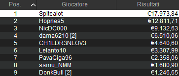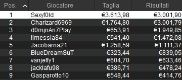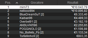 Arricchiamo il report con il più importante torneo del lunedì sera, ovvero il NoS da 70mila euro garantiti delle ore 21:00. Tra 217 rientri e 170 posti pagati qui abbiamo assistito a un deal: gli ultimi due finalisti han smesso di giocare alle 5:22 meritandosi oltre 10mila euro a testa. Per la precisione 10.896 euro vanno a ‘nellooo994’ e ‘10.643 euro a ‘mim73’. Completa il podio ‘BlueDreamSuT’.