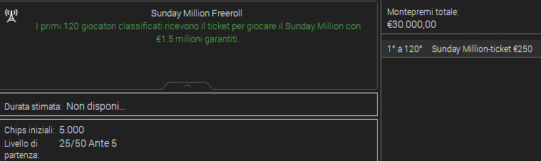 Attenzione ai freeroll di PokerStars.it nell’offerta del poker italiano: sono pochi ma convenienti. Spicca questo weekend ancora il Sunday Million Freeroll domenicale con ben 120 tickets in palio per il Sunday Million del 4 gennaio! Il Freeroll in questione si gioca ogni domenica alle 20:05 con un valore di 30mila euro regalati ogni volta in questo modo.