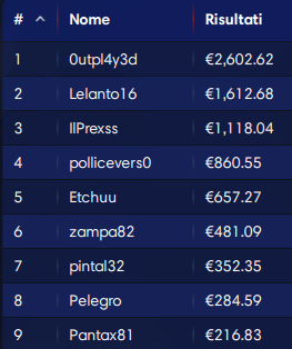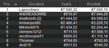 10.000€ Giovedì 6 Max (montepremi 13.552, iscritti 770)