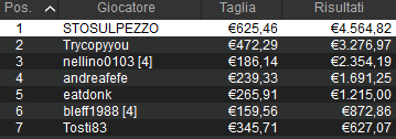 Nella prima serata delle Winter Series spicca anche questo 7-Max Mystery Bounty che garantiva 75mila euro dalle 21:15. In mezzo a 2.426 rientri e 580 posti pagati è stato qui ‘STOSULPEZZO‘ a vincere alle 5:40. La miglior taglia, quella da 1.239 euro, è andata al 17° classificato ‘jesuskhane‘.