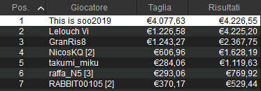 E nel torneo 7-Max Progressive KO da 50mila euro garantiti delle 19:00 sono stati 469 i rientri con 237 posizioni ITM generate. Il sipario qua è calato alle 2:14 quando ‘This is soo2019‘ ha preso 4.077 euro di taglia e un totale di 8.304 euro. A completare il podio ‘Lelouch Vi’ e ‘GranRis8’.
